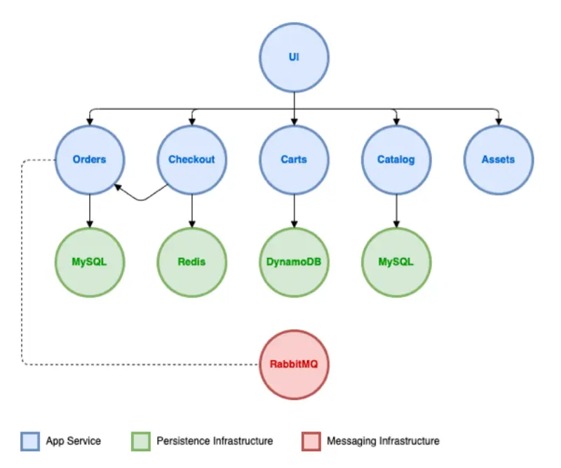 Each component in the sample application is implemented in its own namespace. For example, the 'ui' component is deployed in the 'ui' namespace, whereas the 'catalog' web service and 'catalog' MySQL database are deployed in the 'catalog' namespace.